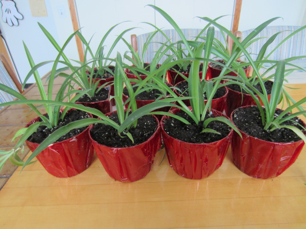 I repotted the spider plant and took off 2 dozen clippings. They are now a good size and need to be put into larger pots so I bought 2 dozen new pots and covered them in red for Valentine’s Day.