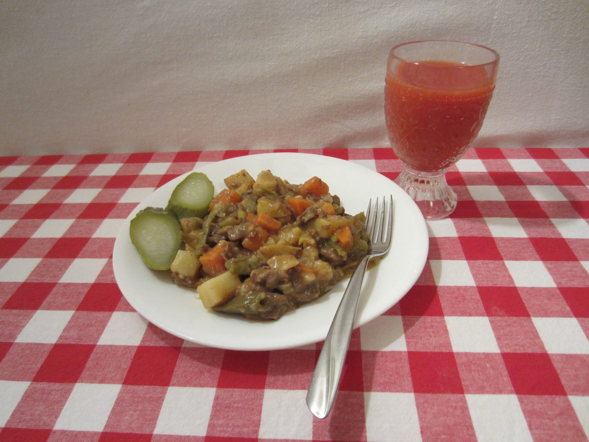 I strained out the meat & onions to add later on to the pot when the vegetables are done. Throw away the bay leaves. In a pot I then cooked the following vegetables in the 2 cups meat juice until done: