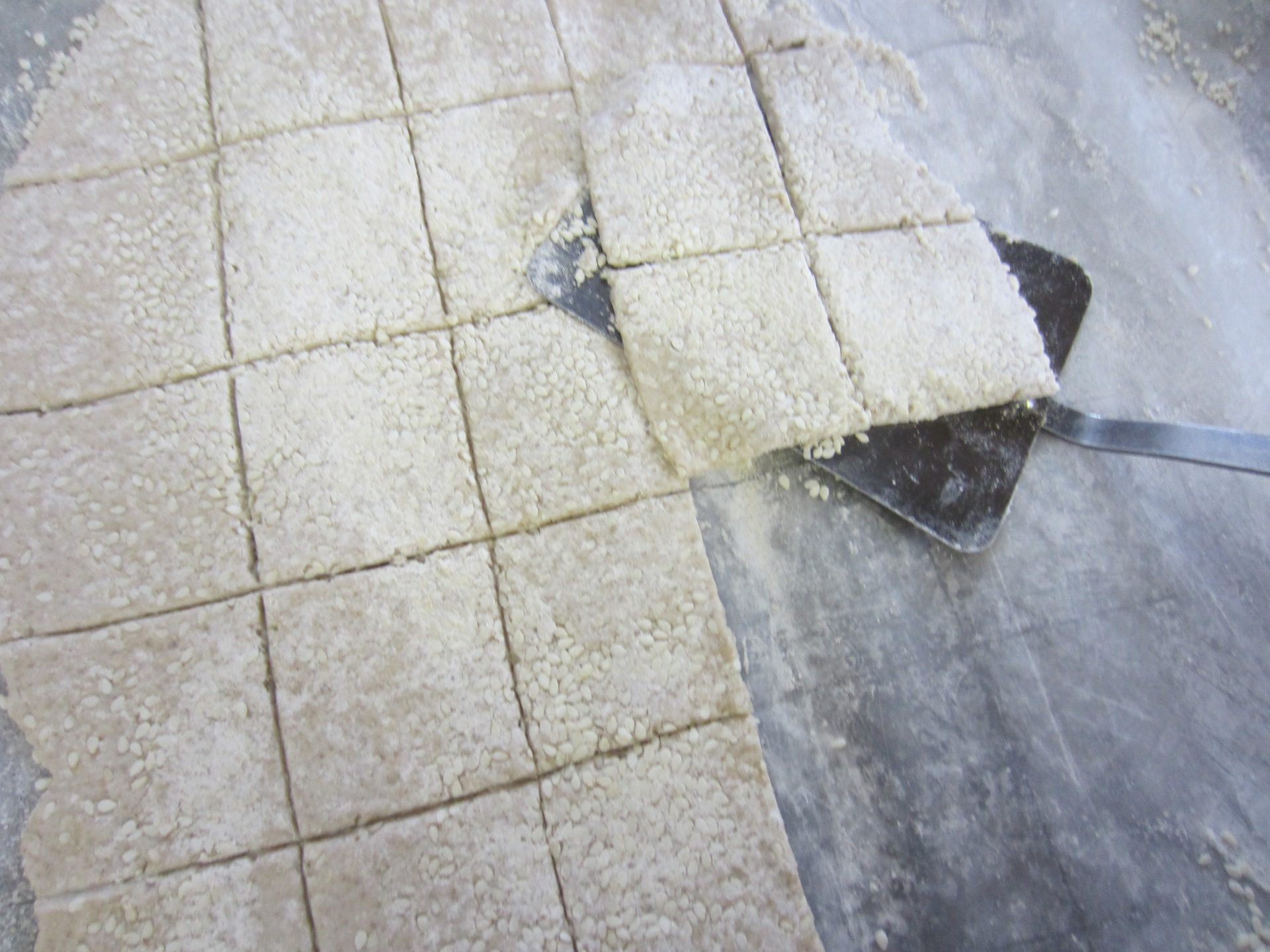 Using a pizza cutter, cut into 1 1/2 inch squares. Place them on a greased cookie sheet. Bake 8 – 10 minutes, or longer if needed to turn lightly brown. As they brown, remove them from the oven.