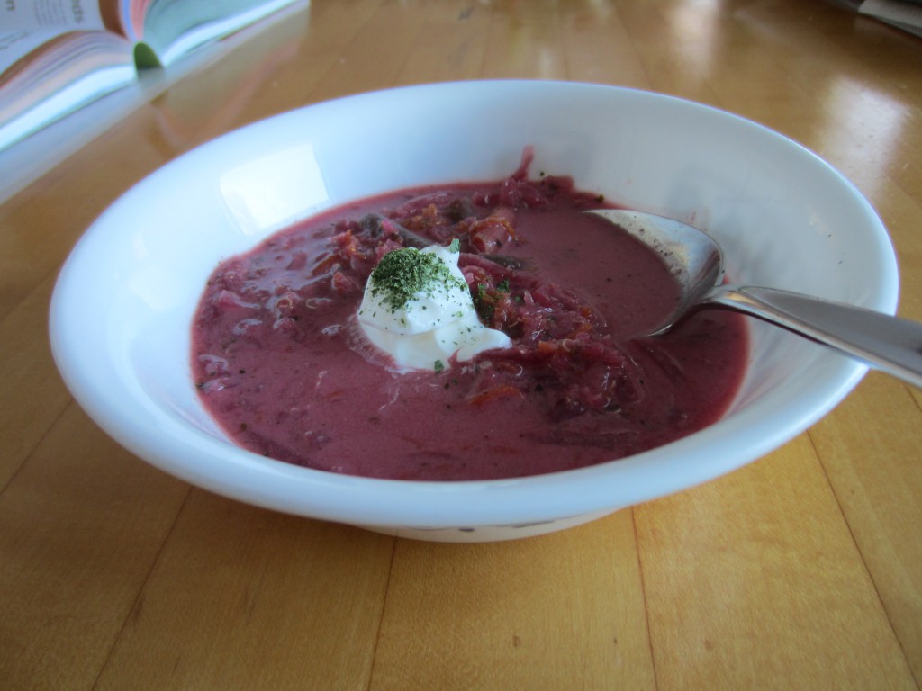 The pause was over quite quickly when I realized I was hungry & wanted something different to eat; something packed with nutrition. I had read George Mateljan’s post on the nutrients of beets so headed to the freezer for some frozen beets and frozen bone broth. I could hardly wait for a bowl of Beet Borscht.