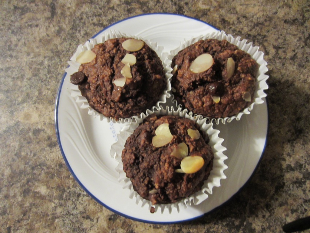 From the ingredients below I saved a few slivered almonds and 26 chocolate chips for on top of each muffin.