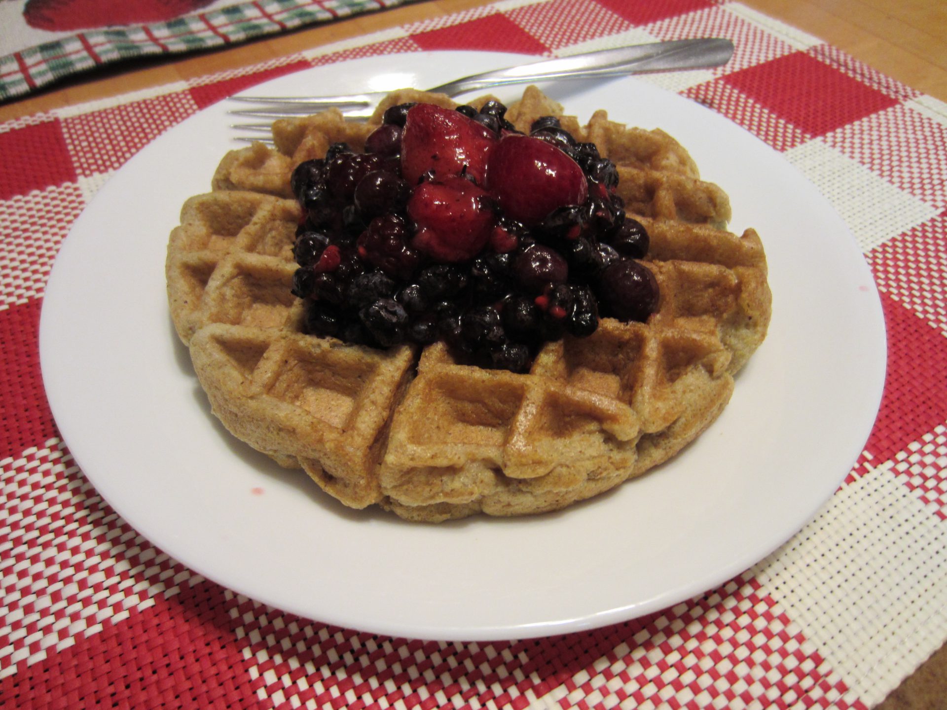 For lunch today I am making pancakes/waffles. I like waffles and Melvin likes pancakes so we are both happy. The following recipe made 6 pancakes and two thick Belgium waffles.